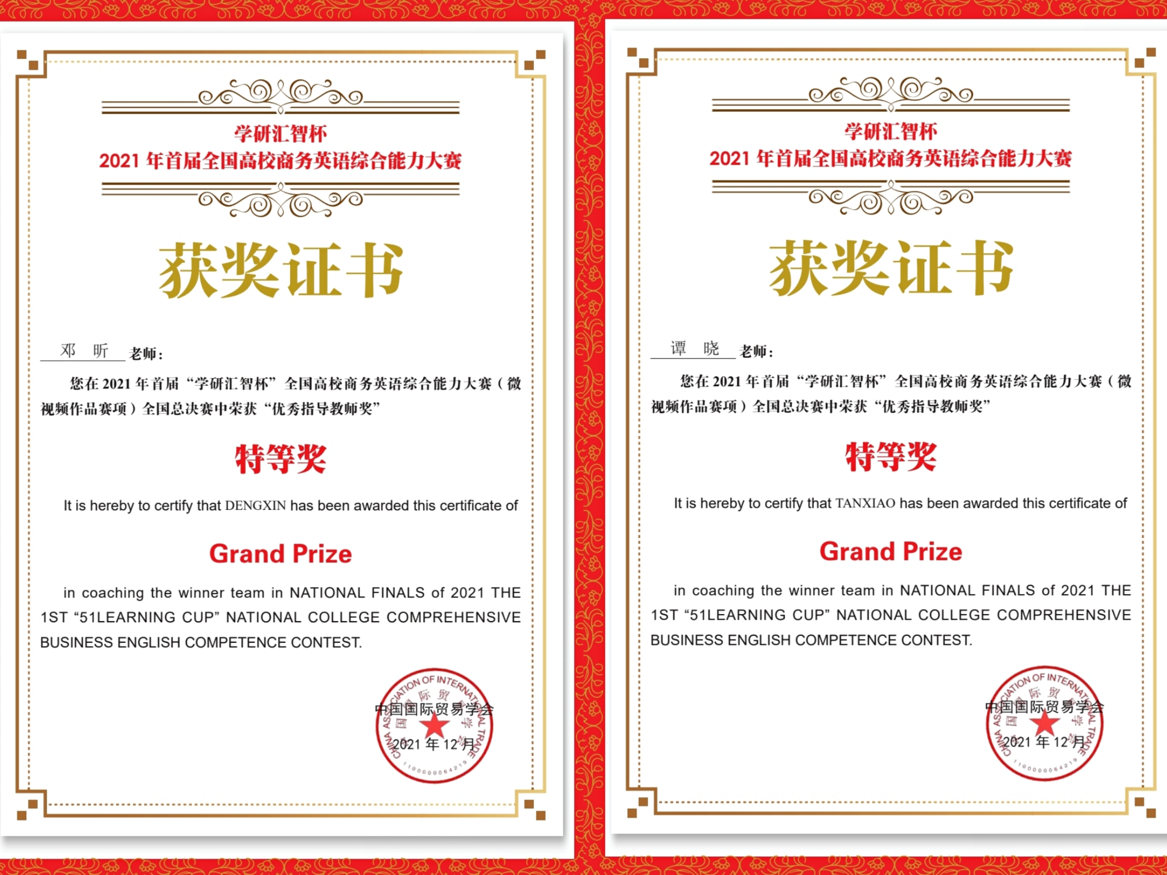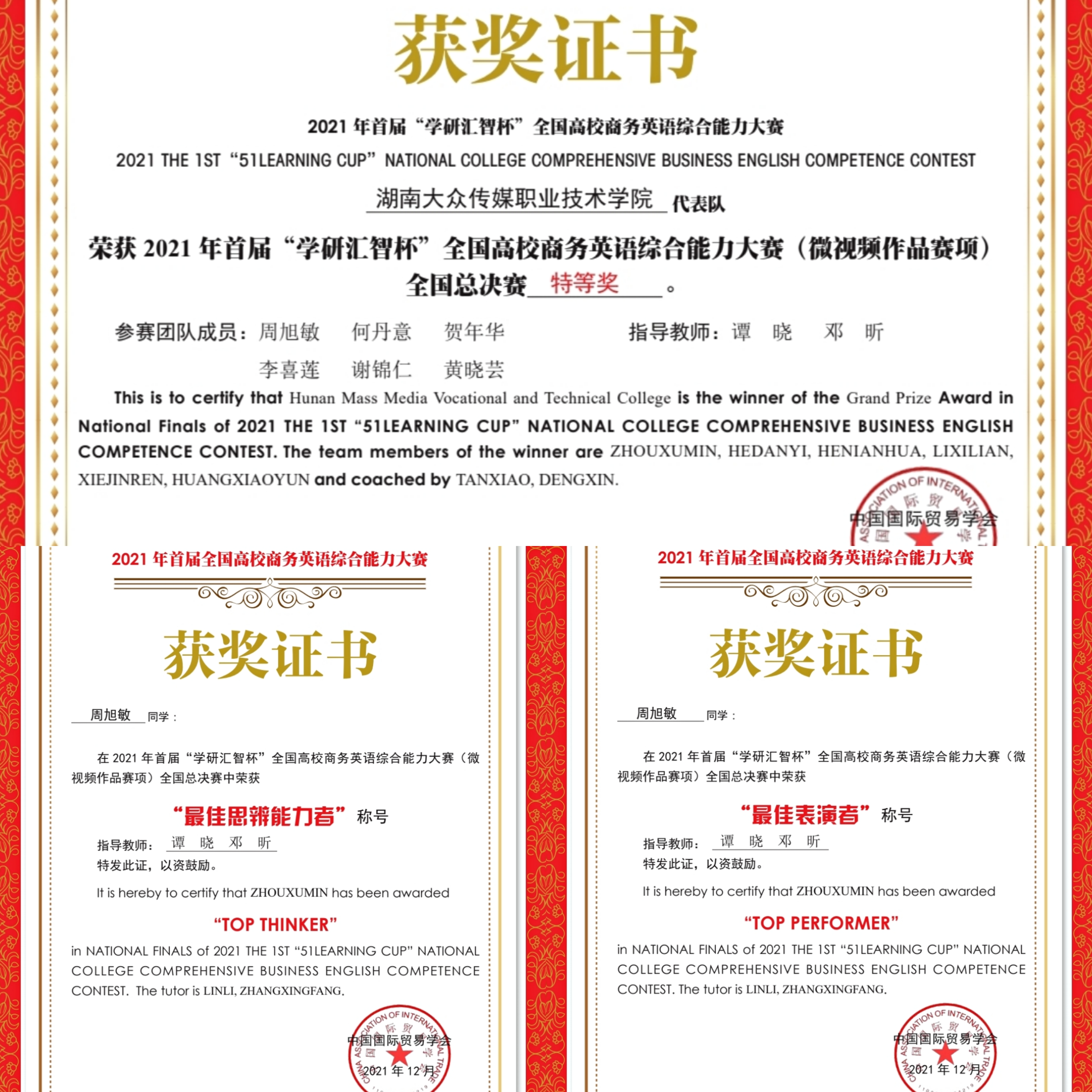 (国际传播学院 邓昕供稿)2021年首届全国高校商务英语综合能力大赛(微视频作品赛项)全国总决赛于2021年12月11日以线上线下相结合并同步直播的方式举办。我院选派的参赛团队荣获高职组团队特等奖,同时还获得2个单项奖。