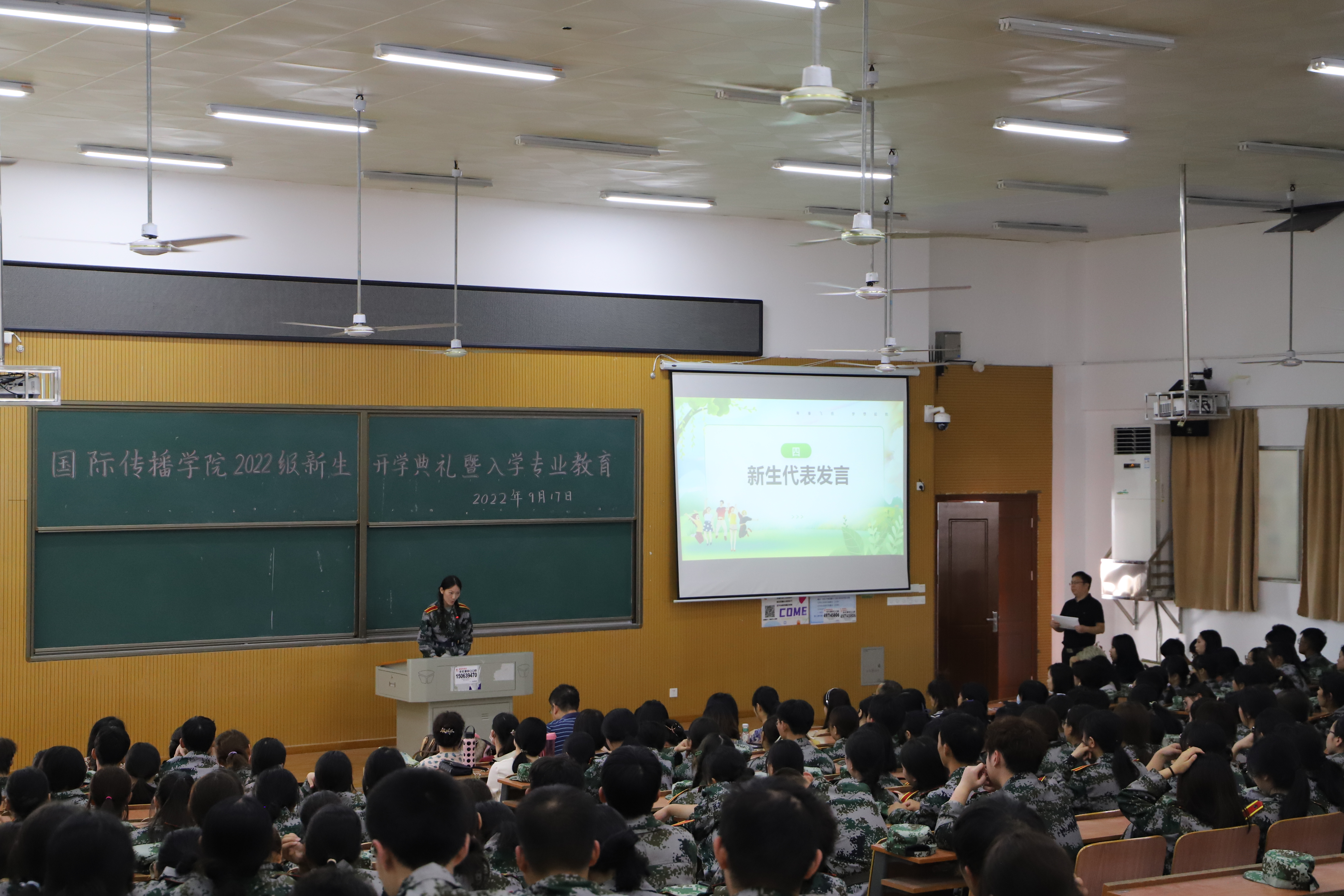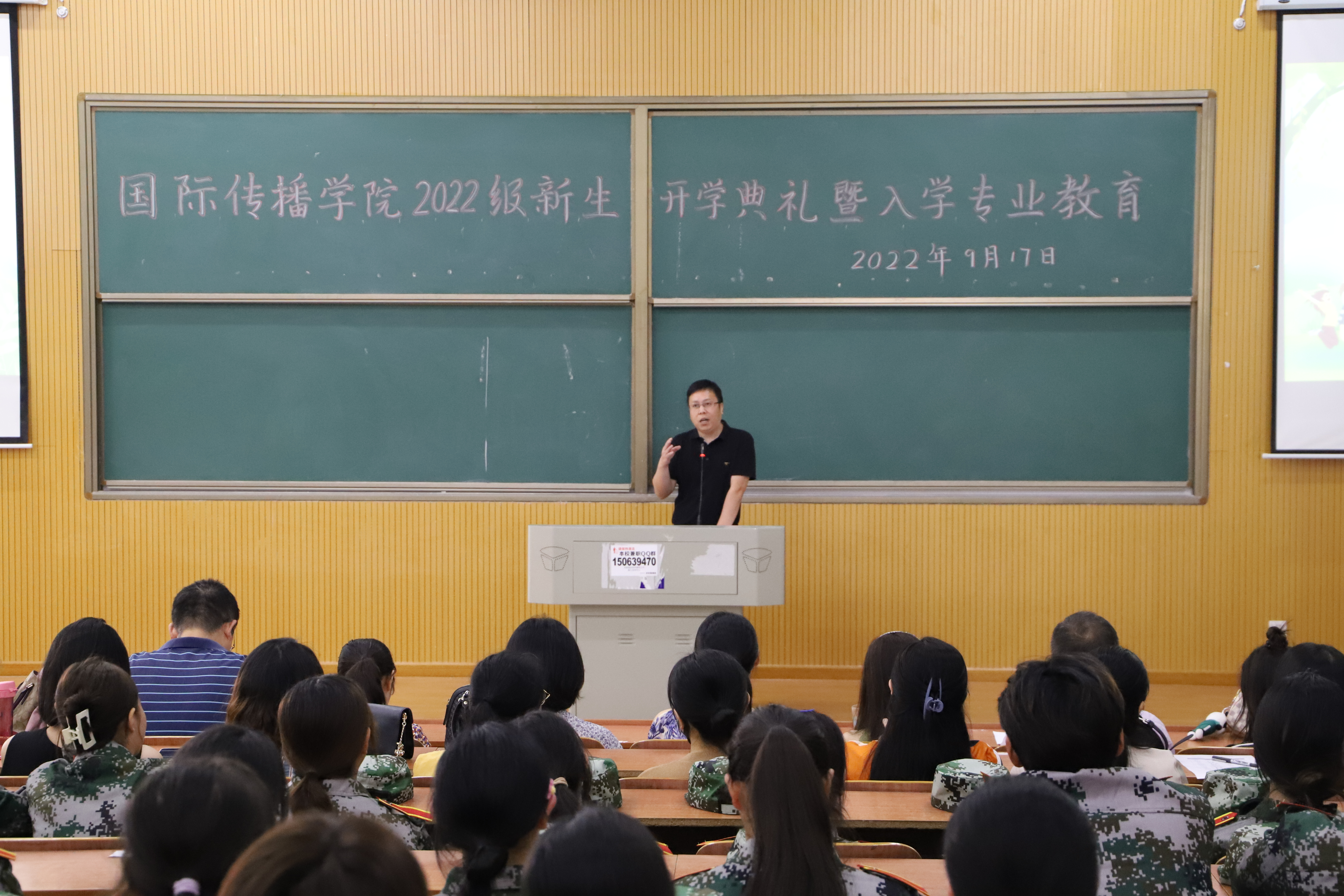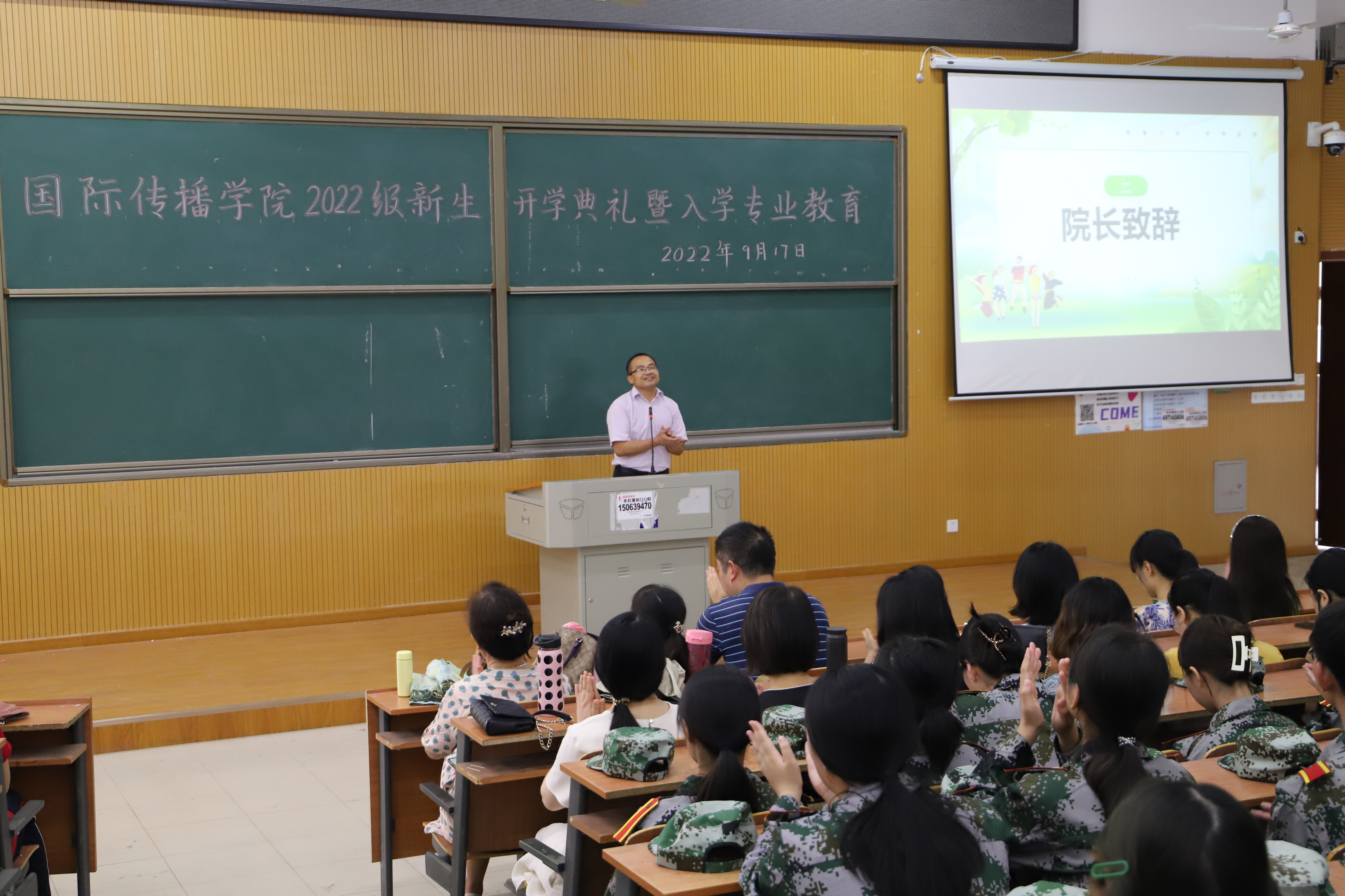 首先,孙益民院长代表国际传播学院对新同学的到来表示最热烈的欢迎!向新生介绍了学校概况后,着重介绍了我院具有四个“好”。第一个“好”是生源质量好,今年录取分数线已逼近本科线;第二个“好”是学习风气好,学院管理较严,老师要求较严,同时学生比较自律;第三个“好”是教学质量好,今年学生如期毕业率达到91%,升本率为20.17%;四是就业形势好,每年的就业率都达到了90%以上。最后,孙院长向新生提出了五点要求:要敬畏法律,严守纪律,做一个守规矩的学生;要尊敬师长,友爱同学,做一个受欢迎的学生;要勤于锻炼,善于沟通,做一个身心健康的学生;要明确目标,制定规划,做一个生活充实的学生;要刻苦学习,积极上进,做一个有本事的学生。