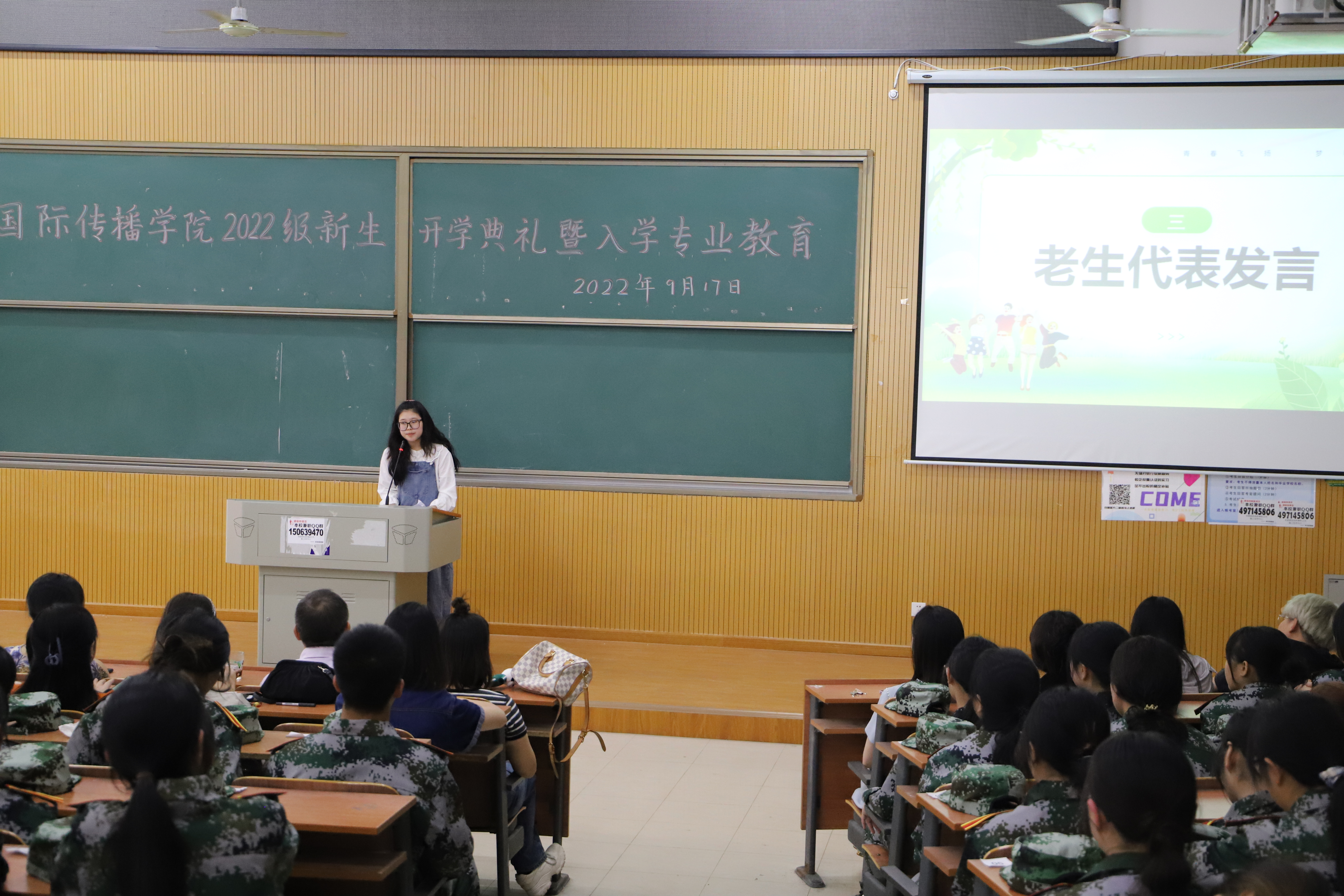 随后,商务英语专业2001班的王杨同学代表老生发言,向新生无私分享了自己的生活、学习经验,祝愿学弟学妹们不断进步。商务英语专业2204班杨星月同学代表新生发言,号召大家要明确目标,勤学善思;学以致用,开拓创新;提高素质,去迎接未来的挑战。