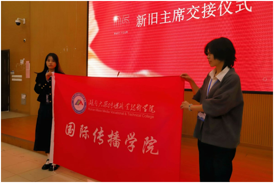 颁奖仪式结束后,国际传播学院学工办主任邹源宣读了第十届团学会学生干部名单。随后,第九届团学会主席罗冰将学院院旗交接到第十届团学会主席姚思怡手中,将学院团学会光荣的使命和责任交到了新的集体手中。