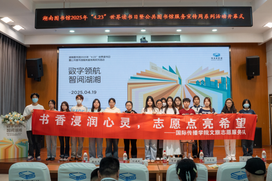 为响应全民阅读的号召,营造“爱读书、读好书、善读书”的浓厚氛围,国际传播学院团总支“美美‘语’共”志愿服务队于4月19日上午前往湖南图书馆参与其举办的2025年“4.23”世界读书日暨公共图书馆服务宣传周系列活动开幕式。