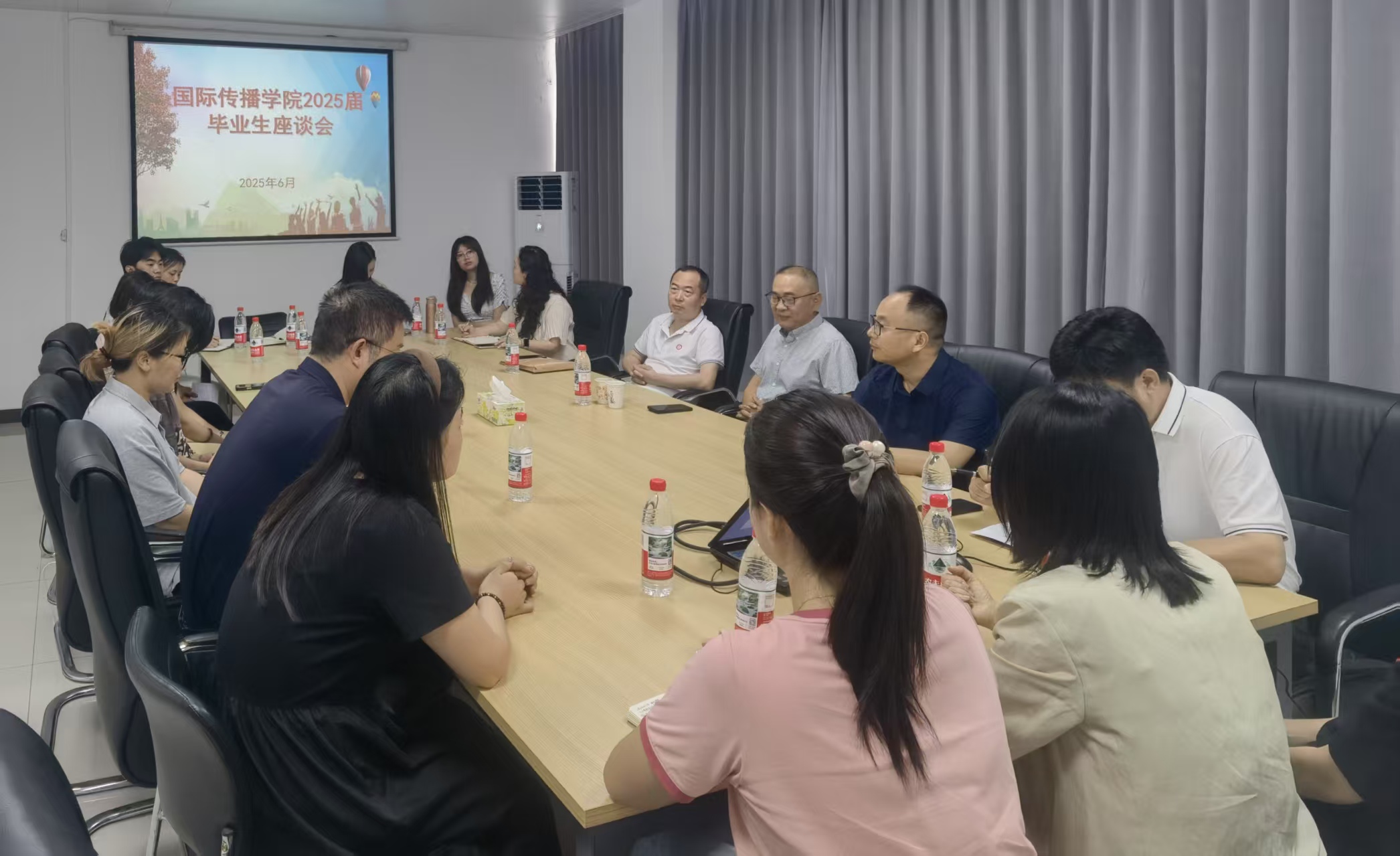 6月10日,国际传播学院2025届毕业生离校座谈会在教学楼E408举行。副校长朱丹出席并讲话,国际传播学院学院院长黄林非、党总支书记何发胜及教师代表、毕业生代表、在校生代表齐聚一堂,共同回忆青春岁月,畅谈未来发展。座谈会由学院党总支副书记李勇主持。